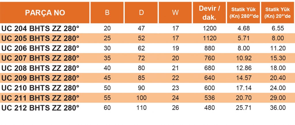 Yüksek Isıya Dayanıklı Yataklı Rulmanlar Yüksek Isı Yataklı RulmanlarAisi52100 (Krom Çelik) özel stabilize.Radyal Boşluk yüksek ısı için özel dizayn edilmiştir. (4xC5)Bütün parçalar Manganez Fosfat kaplanmıştır.Çelik kafes yapısına sahiptir.280 C Sıcaklığa kadar dayanıklıdır.